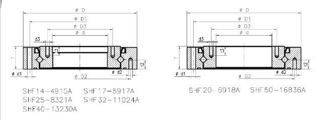 | SHG40-9524A | 108 | 170 | 30 | 158 | 158 | --- | 122 | 12-Φ6.6 | 6-M4 | --- | (16-M6)+(4-M5) | --- | 8/10 | 0.5x45° | 42.1 | 68.4 | 2.79 | |